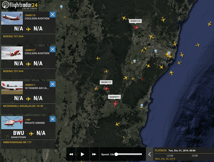 I found two helicopters fighting a fire near the Warragamba River. These are P2-CHY and N247AC. Both use the river as a water source and go there at regular time intervals.